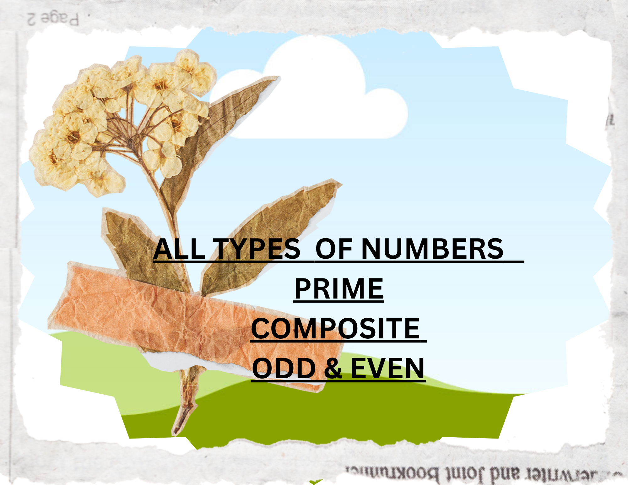 •प्राकृतिक संख्या :NATURAL NUMBER 1,2,3,4,5,6,7,8,9………………………………. ये सारी प्राकृतिक संख्या होती है WHOLE NUMBER :: पूर्ण संख्या 0,1,2,3,4,5,6,7,8,9…………………….. 0 से लेकर आगे बढ़ने वाली सारी संख्या पूर्ण संख्या कहलाती है I EVEN NUMBER : सम संख्या 2 से विभाजित होने वाली सारी संख्या सम संख्या कहलाती है I 2,4,6,8,10,12………………………………….. ODD NUMBERS : विषम संख्या वो संख्या जो 2 से विभाजित नहीं होती वो सारी संख्या विषम संख्या कहलाती है I 1,3,5,7,9,11……………………………………. समग्र संख्या : Composite Number संख्या 1 को छोड़ कर जो भी संख्या अविभाज्य (prime)नहीं होती वह संख्या समग्र संख्या कहलाती है I जैसे :4,6,8,9,12………… संख्या 1 न ही अविभाज्य (prime)है न ही समग्र (composite) है I